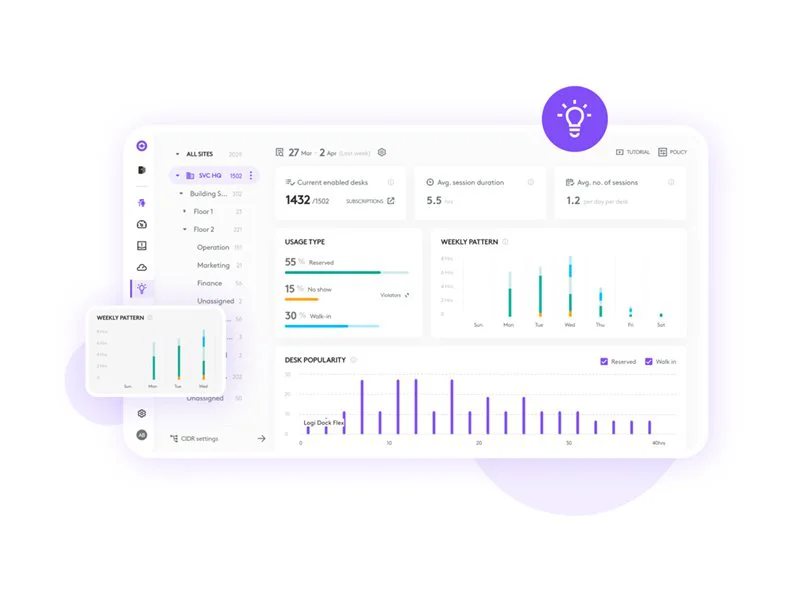 Find the perfect desk within seconds. Filter by equipment, location, and type of working space to find the ideal seat.