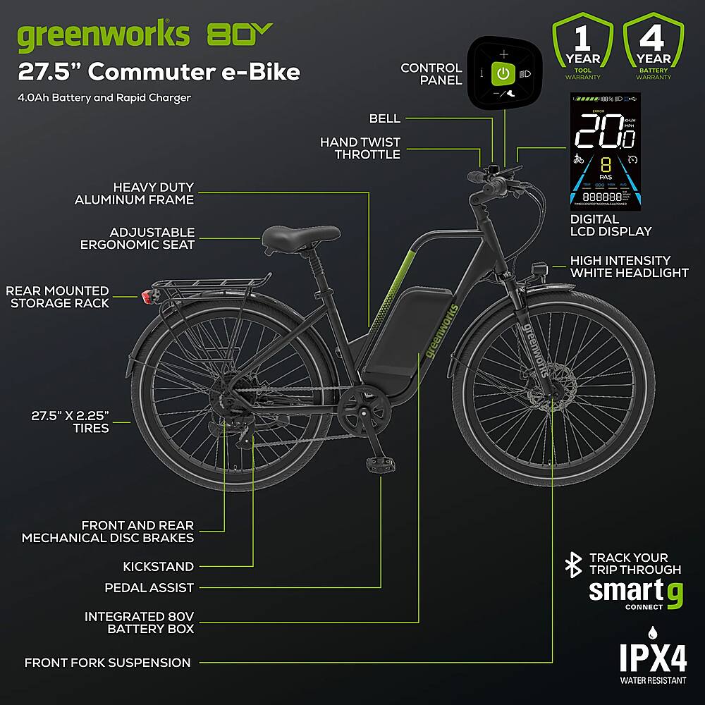 Greenworks - 80V 27.5" Venture Series Commuter EBike w/ 22mi. Max Op. Range & 22mph Max Speed w/ 4.0Ah Battery & Charger - Black