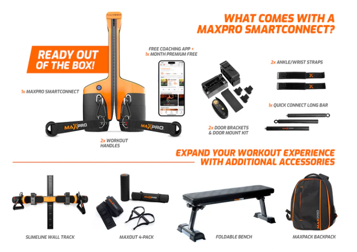 What's Included:  MAXPRO SmartConnect, 3-piece Quick Connect Long Bar, Set of MAXPRO Workout Handles, Set of MAXPRO Ankle/Wrist Straps, Maxpro Door Mount System, USB Charger