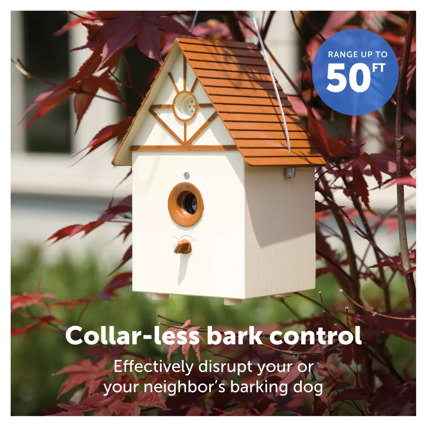 Bring peace and quiet to your backyard using the PetSafe Outdoor Bark Control. Cleverly disguised as a birdhouse, the unit can be placed anywhere in your yard or hung from a tree. Whenever your dog (or your neighbor's dog) barks, he will hear a safe, but annoying ultrasonic sound that's inaudible to humans. As soon as he stops barking, the ultrasonic sound stops. The unit can only detect your dog's bark when he is in front of it, so picking the best placement for your unit is key! This weatherproof unit covers 1/4-acre area, but if you need more coverage, simply purchase additional units for your entire backyard area. The battery-operated device uses 1 9-volt battery and lasts up to 2 months depending on how often your dog barks. With a little time and patience, your dog will learn not to bark in the backyard so you can enjoy the outdoors together, peacefully. Trust PetSafe to help keep your pet healthy, safe and happy.