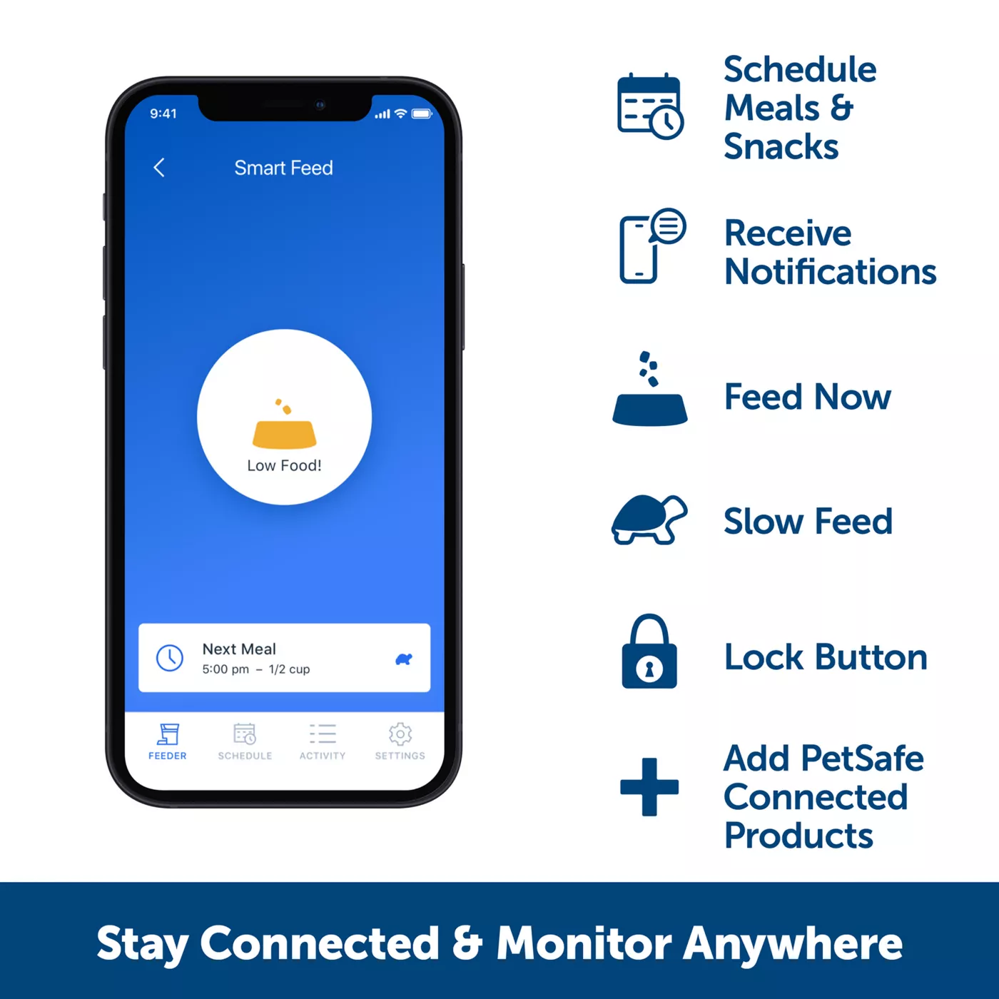 With your smartphone in hand, you can feed your best friend anytime, from anywhere. The PetSafe Smart Feed 2nd Generation Automatic Pet Feeder was thoughtfully designed for pet parents and their pets to bring peace of mind to mealtime. When you download the free, PetSafe Smart Feed app to your smartphone and connect the feeder to your home’s Wi-fi, you'll be able to schedule, adjust and monitor your pet's meals whether you’re at home or at the office. The new, low food sensor will send a notification to your phone when the feeder is running low on kibble and when it is empty, so you can pick up more kibble on the way home. The Smart Feed Automatic Pet Feeder holds 24 cups of dry or semi-moist food. The unique design of the Smart Feed's food conveyor dispenses most shapes and sizes of dry and semi-moist food while helping to prevent jams. Meals can be scheduled for up to 12 times daily in sizes from 1/8 cup to 4 cups per meal. The optional SlowFeed setting dispenses meals larger than 1/8 cup in small amounts over 15 minutes for pets who tend to eat too quickly. There is also a Feed Now option that lets you serve a meal instantly from the app or with the push of the pet-proof button on the feeder. The PetSafe Smart Feed Automatic Pet Feeder includes a stainless-steel bowl with a removable holder to prevent your pet from tipping or moving the bowl. The feeder components are top-rack dishwasher safe to make cleaning simple. feeder includes an AC power adaptor and has a backup battery option using 4 D alkaline batteries (not included). To connect your PetSafe Smart Feed Automatic Pet Feeder to your smartphone app, a 2.4GHz (802.11b/g/n) router is required. Devices that work with the mobile app are iPhones or iPods with iOS 9.0 or later and compatible Android smartphones version 6.0 or later. One feeder can be controlled from multiple family members' smartphones. Multiple feeders also can be controlled from one smartphone within the PetSafe Smart Feed app. PetSafe brand is here to help you and your pet live happy together.